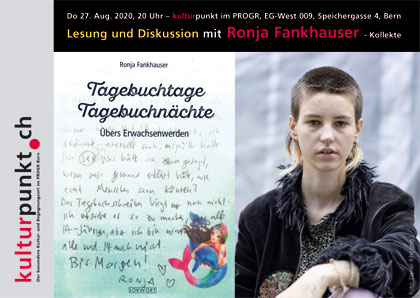 Die Jungautorin hat mit ihrer Maturaarbeit in den Medien viel Beachtung gefunden. Ronja liest und diskutiert erstmals öffentlich in Bern. Eintritt Kollekte; Reservation erwünscht: info@kulturpunkt.ch