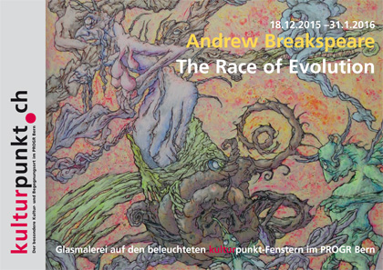 Eine Besonderheit des Künstlers Andrew Breakspeare ist seine Glasmalerei. Speziell für die kulturpunkt-Fenster fertigte Breakspeare eine neue Bilderserie zum Thema «The Race of Evolution» an, die bis zum 31. Januar 2016 jeden Abend angeleuchtet wird.