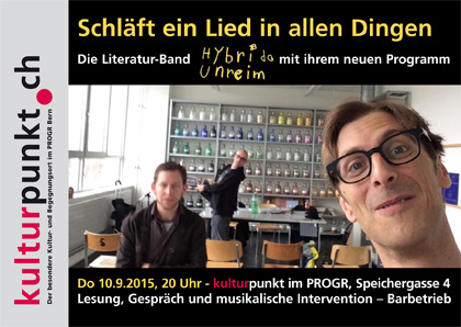 Literatur-Band Hybrido Unreim aus Bern mit dem neuen Programm: «Schläft ein Lied in allen Dingen». Eine Mischung aus Lesung, Gespräch und musikalischer Intervention