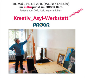 Kreativ_Asyl ist ein Nonprofit-Projekt von Künstler/innen im PROGR Bern, die geflüchteten Kunst- und Kulturschaffenden ihre Unterstützung anbieten. Bis Ende Juli betreibt Kreativ_Asyl eine Kunstwerkstatt im kulturpunkt. Geflüchtete Kunst- und Kulturschaffende können ohne Anmeldung in der Kreativ_Asyl-Werkstatt ihre Anliegen einbringen und einen freien Arbeitsplatz benutzen. Die Werkstatt ist öffentlich, Besucher/innen sind willkommen.
