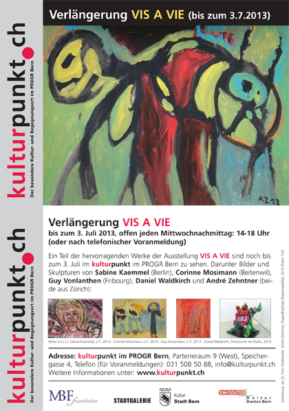 Ein Teil der hervorragenden Werke der Ausstellung VIS A VIE sind noch bis zum 3. Juli im kulturpunkt im PROGR Bern zu sehen. Darunter Bilder und Skulpturen von Sabine Kaemmel (Berlin), Corinne Mosimann (Beitenwil), Guy Vonlanthen (Fribourg), Daniel Waldkirch und André Zehntner (beide aus Zürich):